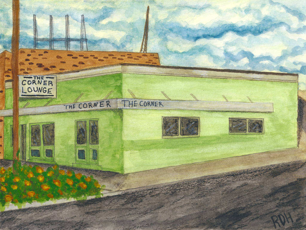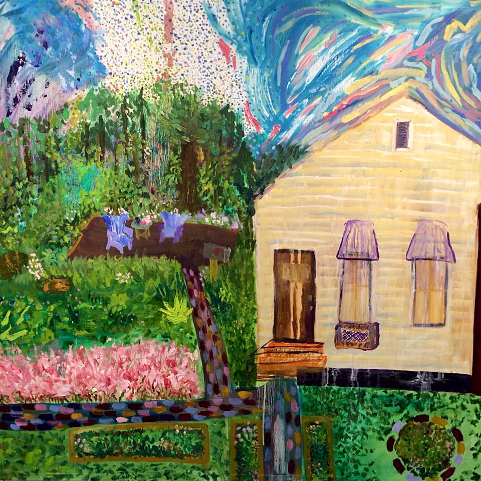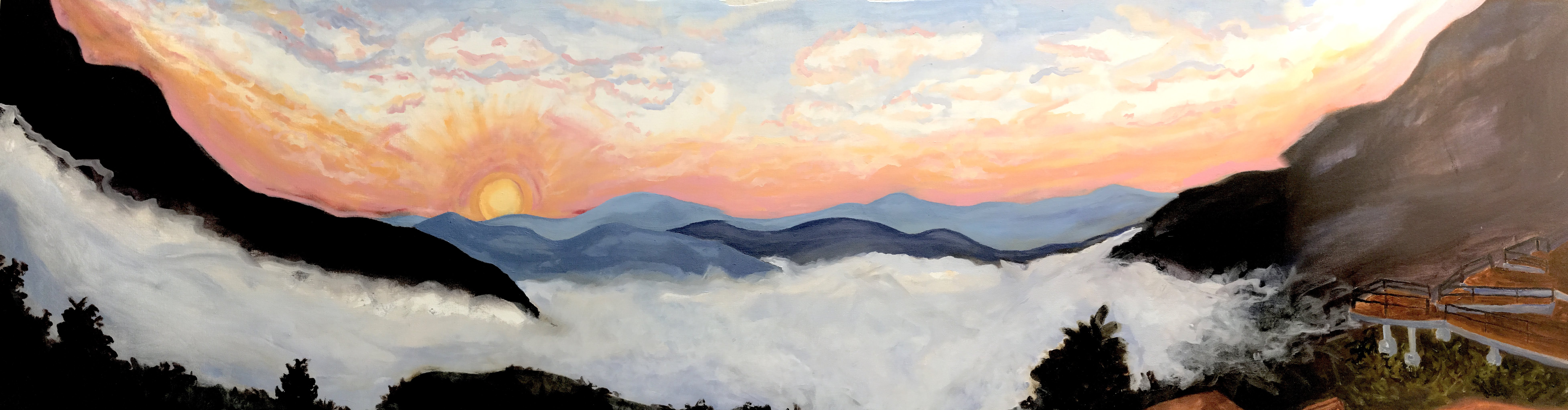 View From Pisgah Inn (2019, oil on canvas 24″ x 84″)Forks Of The River (2018, oil on canvas)Planet Claire (2019, oil on wood panel)The Corner (2024, watercolor and pencil on paper)