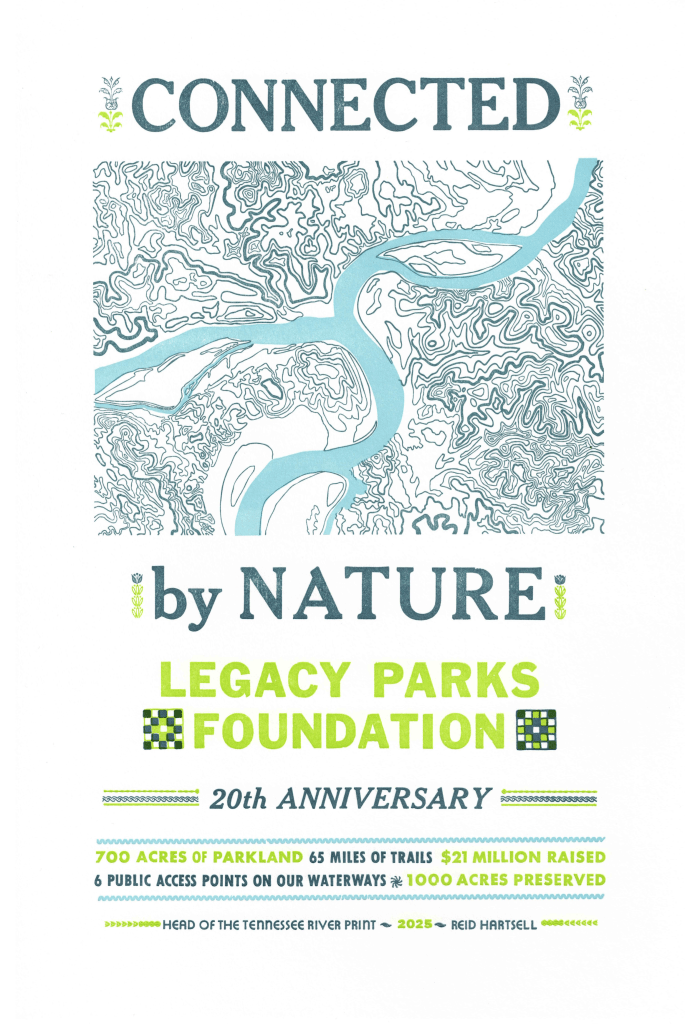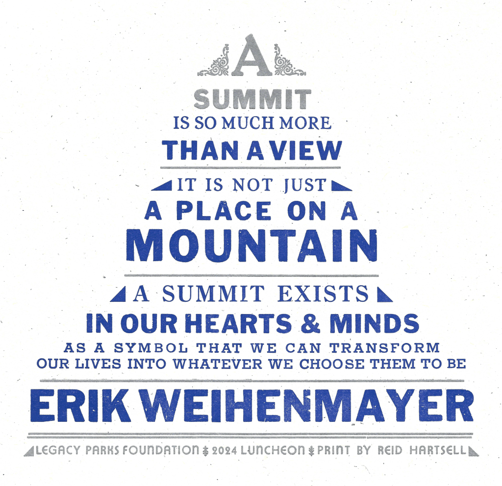 Erik Weihenmayer quote for Legacy Parks Luncheon, letterpress print 8″ x 8″, 2024Legacy Parks Foundation 20th Anniversary poster, 2025, 10” x 15”, letterpress printed from metal type and photopolymer plates.Greeting cards, 2025, 5” x 7”, letterpress printed with metal and wood type